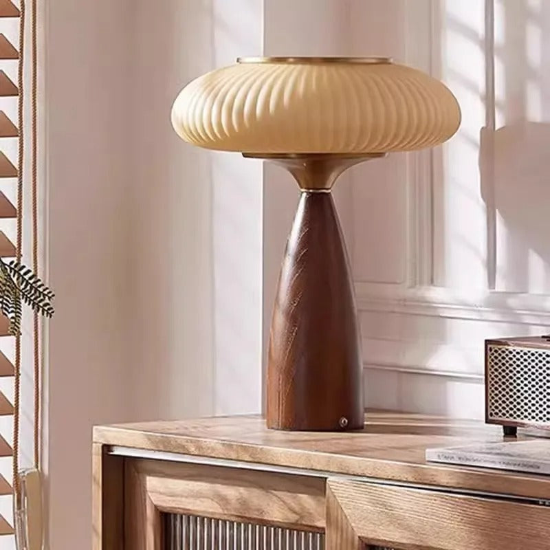 Artystyczny design i ciepłe połączenie drewna i matowego szkła.